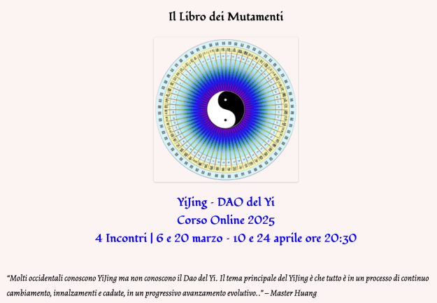 Gli Otto Trigrammi del Cielo Anteriore di FuXi sono le forze–energie–informazioni che soggiaciono alla manifestazione visibile. Ogni mese incontreremo un BAGUA (Trigramma) per conoscerne caratteristiche ed espressioni, così da riuscire a individuarle nella realtà che ci circonda. Inoltre osserveremo l’Esagramma del loro raddoppio nel Libro del YiJing.